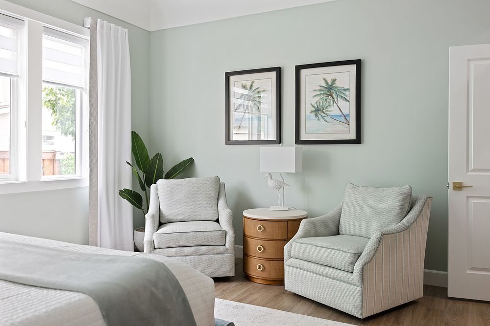 For example, if your living room leans coastal with sandy neutrals and navy, bring a lighter variation, such as a desaturated blue, into the guest room. It creates a sense of harmony through color while still giving the space its own identity.